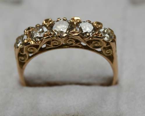 claw set with graduated round brilliant cut diamonds, with scroll pierced gallery