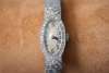 the slim oval champagne coloured dial with black Arabic numerals, with single cut diamond set border to the millegrained bezel, the pierced millegrained borders similarly set with graduated single cut diamonds, fitted to a grey moire strap, contained in a tooled blue leather fitted case stamped EDWARD & SONS LTD...GLASGOW...
