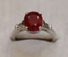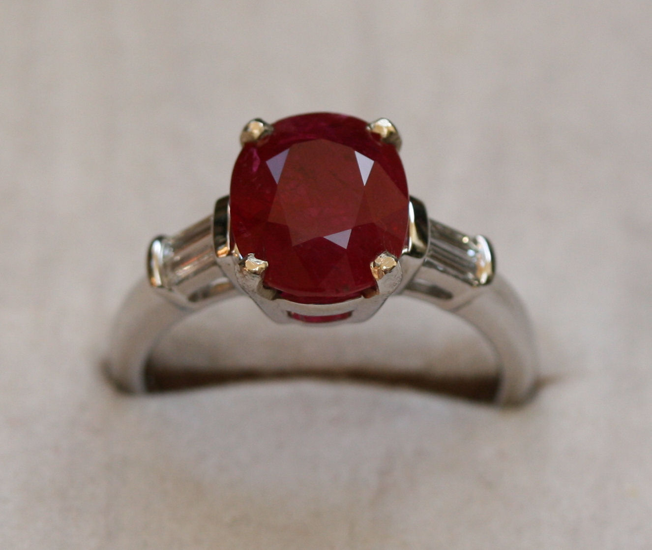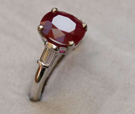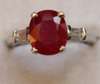 the central claw set oval cut ruby flanked to either side by pairs of baguette cut diamonds
