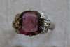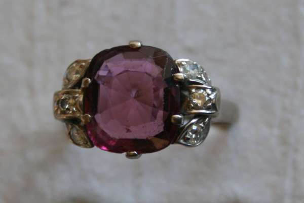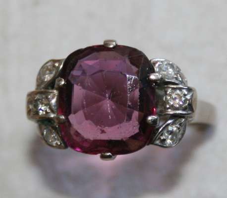 the native cut rounded stone of good lustre with diamond set shoulders, well pierced gallery, white metal shank stamped 14k
