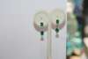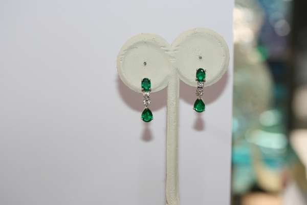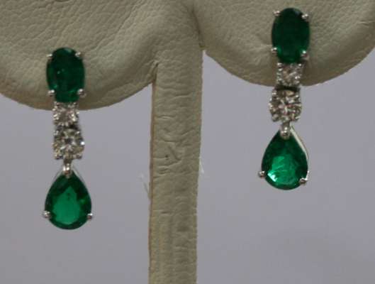 each claw set with an oval cut emerald surmounting a similarly set pear cut emerald, interspersed by two graduated round brilliant cut diamonds, with post and butterfly fittings, stamped 18K