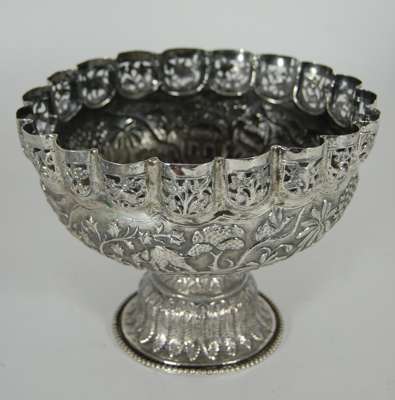 the hemispherical bowl with lobed pierced border, the main body embossed with country scenes and animals, raised on a domed foot