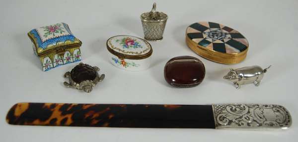 to include a continental gilt metal mounted agate box with inlaid varied agates to cover; a vesta case formed from a seed pot; a continental box formed as a basket of flowers with hinged cover; two porcelain patch boxes; together with a white metal novelty tape measure formed as a pig and a letter opener with tortoiseshell blade (8)