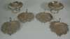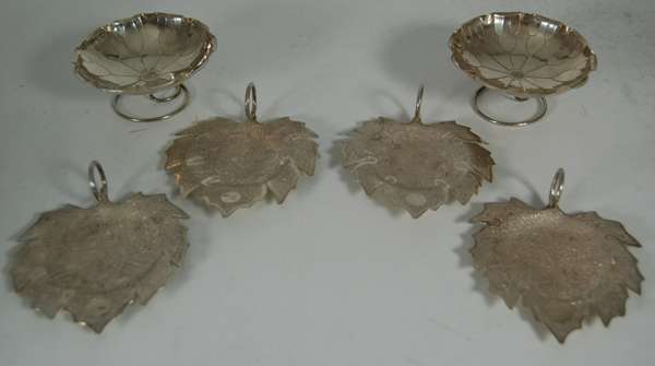 marked LH, 90 and a character mark, formed as flower heads with scalloped rims and engraved details, raised on coiled stems and bases; together with four Indian white metal leaf formed dishes with all over chased decoration and simple loop handles (6)