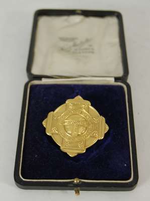 hallmarked 9ct, of shaped circular outline with Celtic panels surrounding a central boss, the reverse engraved 'MOD GHRIANAIG 1925 DONALDA ROBERTSON', in original fitted case