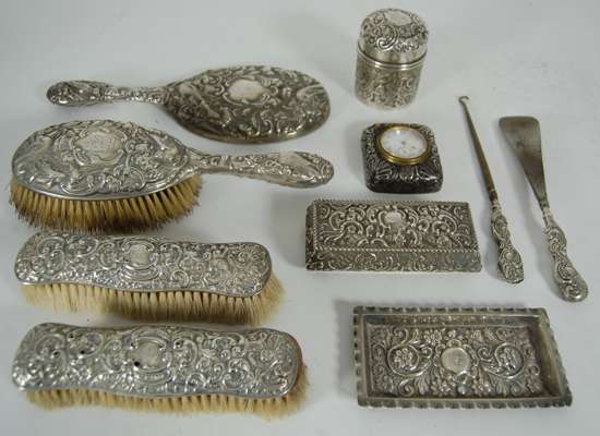 various dates and makers, to include a desk clock, pin tray; jewellery casket; powder jar and cover with various brushes and mirrors etc (qty)
