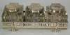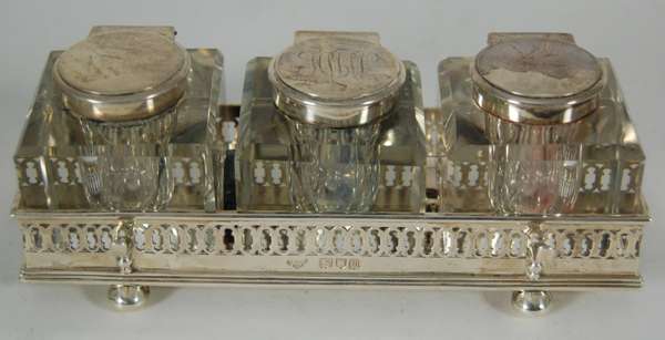 Goldsmiths & Silversmiths company, London 1907, the rectangular frame with pierced borders and raised on simple ball feet, containing three square glass inkwells with hinged flat covers