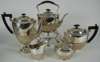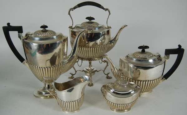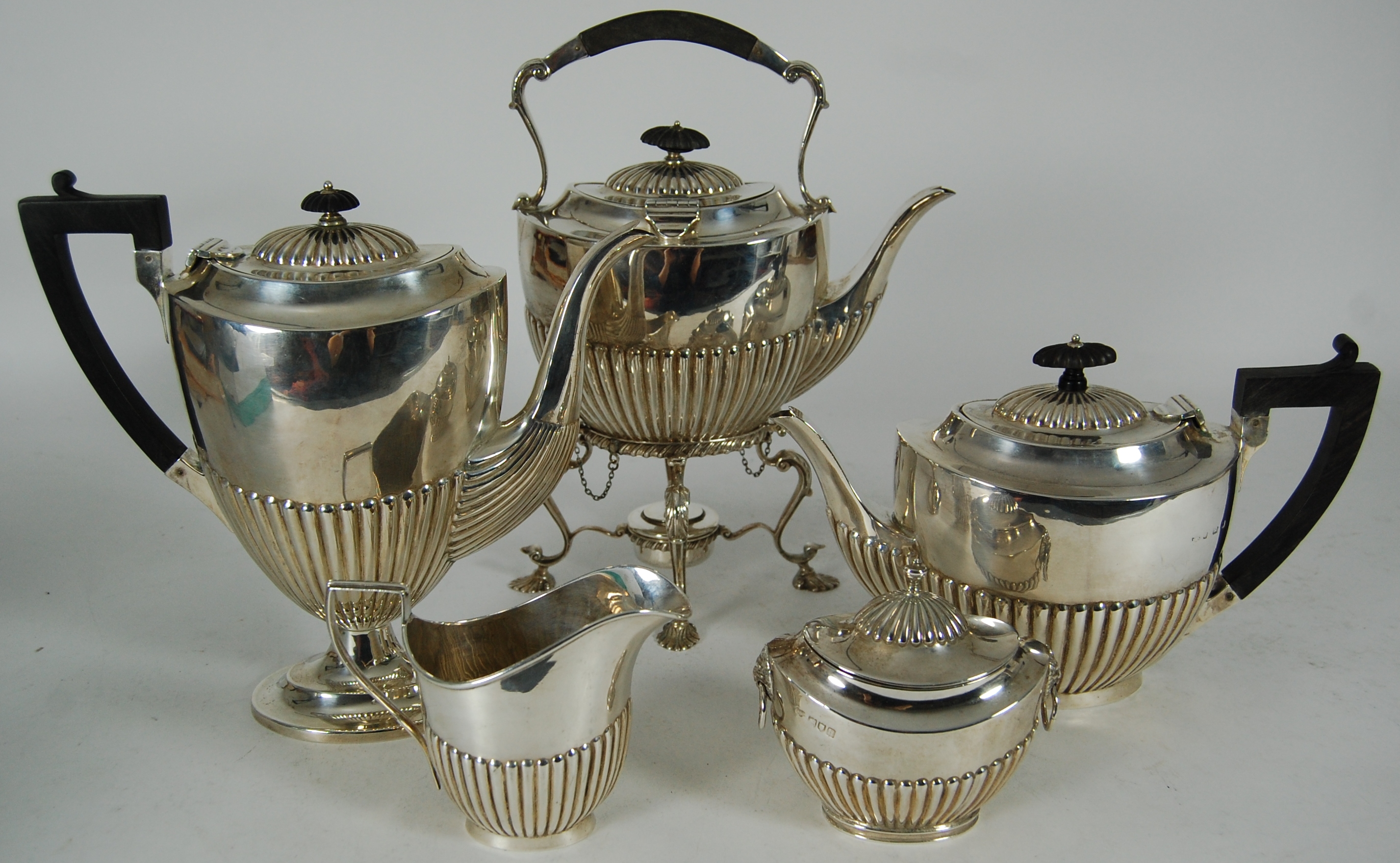 Jones & Compton, Birmingham 1904 and 1905, the sugar box Goldsmiths, London 1903, comprising spirit kettle, stand and burner, coffee pot, teapot, milk jug and sugar box, each with tapered bodies and gadrooned lower section, with angular handles (5)