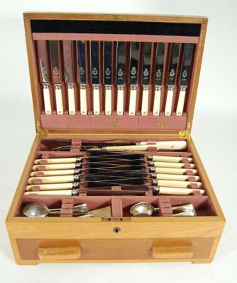 Viners, Birmingham 1929, of Old English pattern with engraved gothic initial W to terminals, comprising twelve each of, teaspoons, soup spoons, dessert spoons, dessert forks, table forks, four tablespoons, with twelve bone handled table and side knives and a three piece carving set all with stained initial W to handles, contained in an oak canteen with hinged lid and single drawer