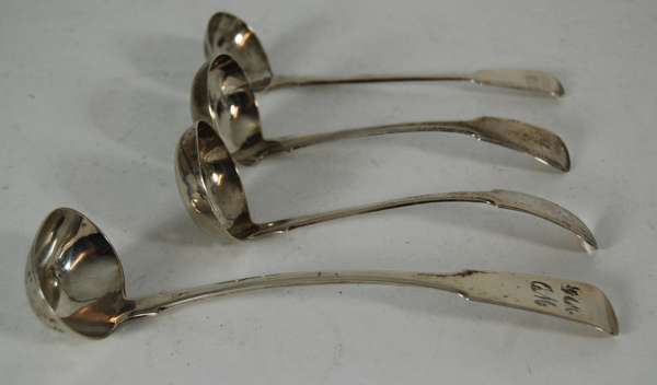 J Pozzi & R Stewart, marked J,P, ELn, R S, of Fiddle pattern with script initials GASM/CM to terminal; together with a pair of Perth toddy ladles by R & R Keay, marked R & RK, eagle, eagle, R & RK and a George Jamieson of Aberdeen example with London marks (4)