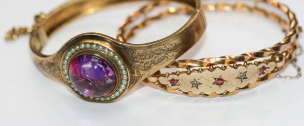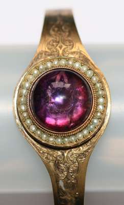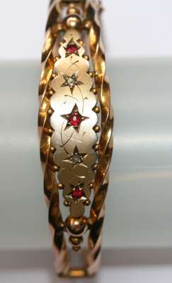 of hinged design, composed of two ropetwisted rows, with central shaped oval panel alternately star set with circular cut red gems and rose cut diamonds; also another hinged bangle the front collet set to the centre with a circular cut quartz cabochon within a border of seed pearls, flanked by engraved scrolls (2)