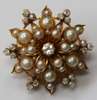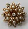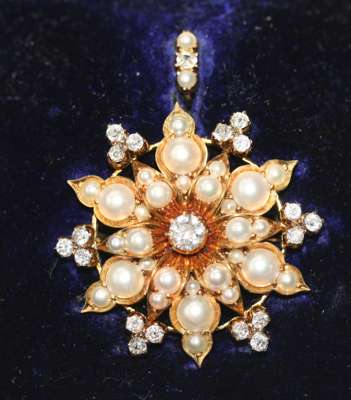 designed as a stylised floral cluster, set with graduated old European cut diamonds and half-pearls, with detachable bale, brooch fittings and safety chain, contained in a maroon leather fitted case