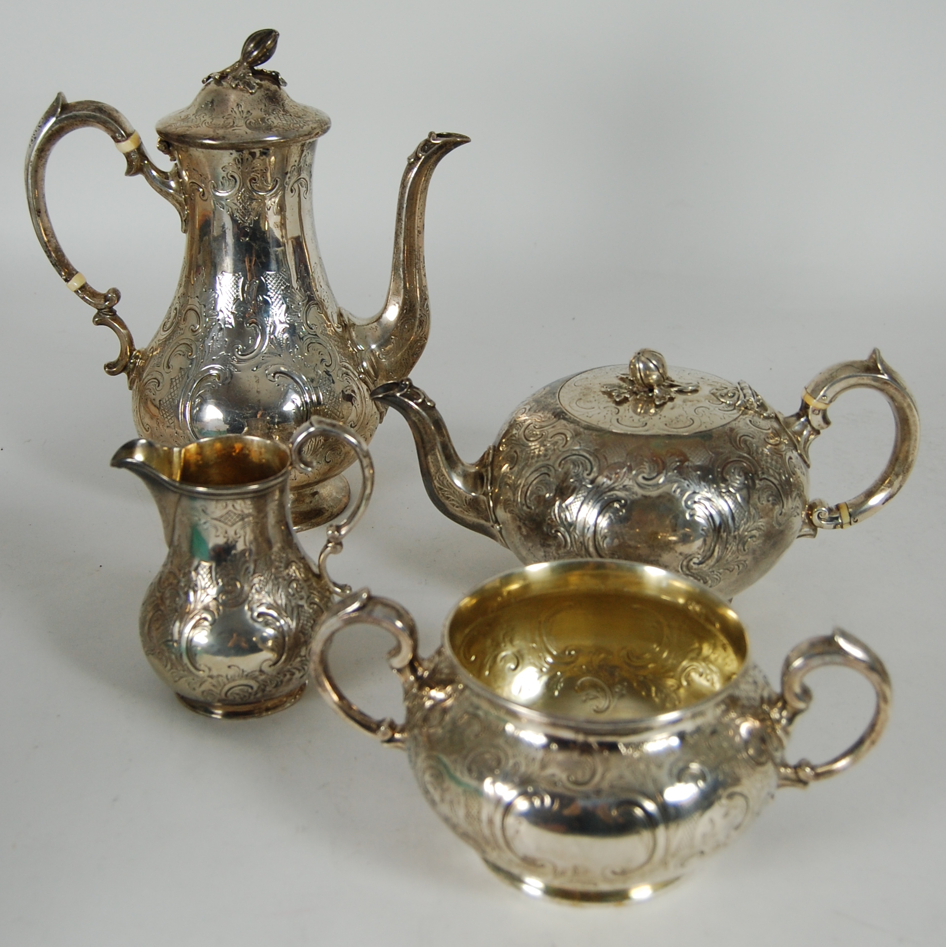 London 1857-60, comprising a teapot, coffee pot, twin-handled sugar bowl and cream jug, each of baluster form, chased and engraved with C-scrolls and stylised foliage (4)