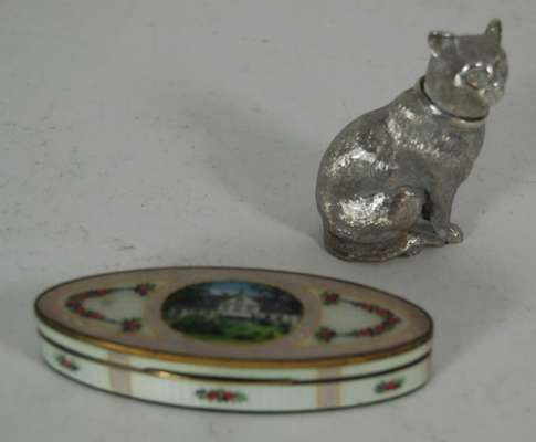 London 1904, formed as a seated cat with pierced pull off head; together with a Continental enamel snuff box with 925 marks, with floral garlands surrounding a house scene to cover (2)