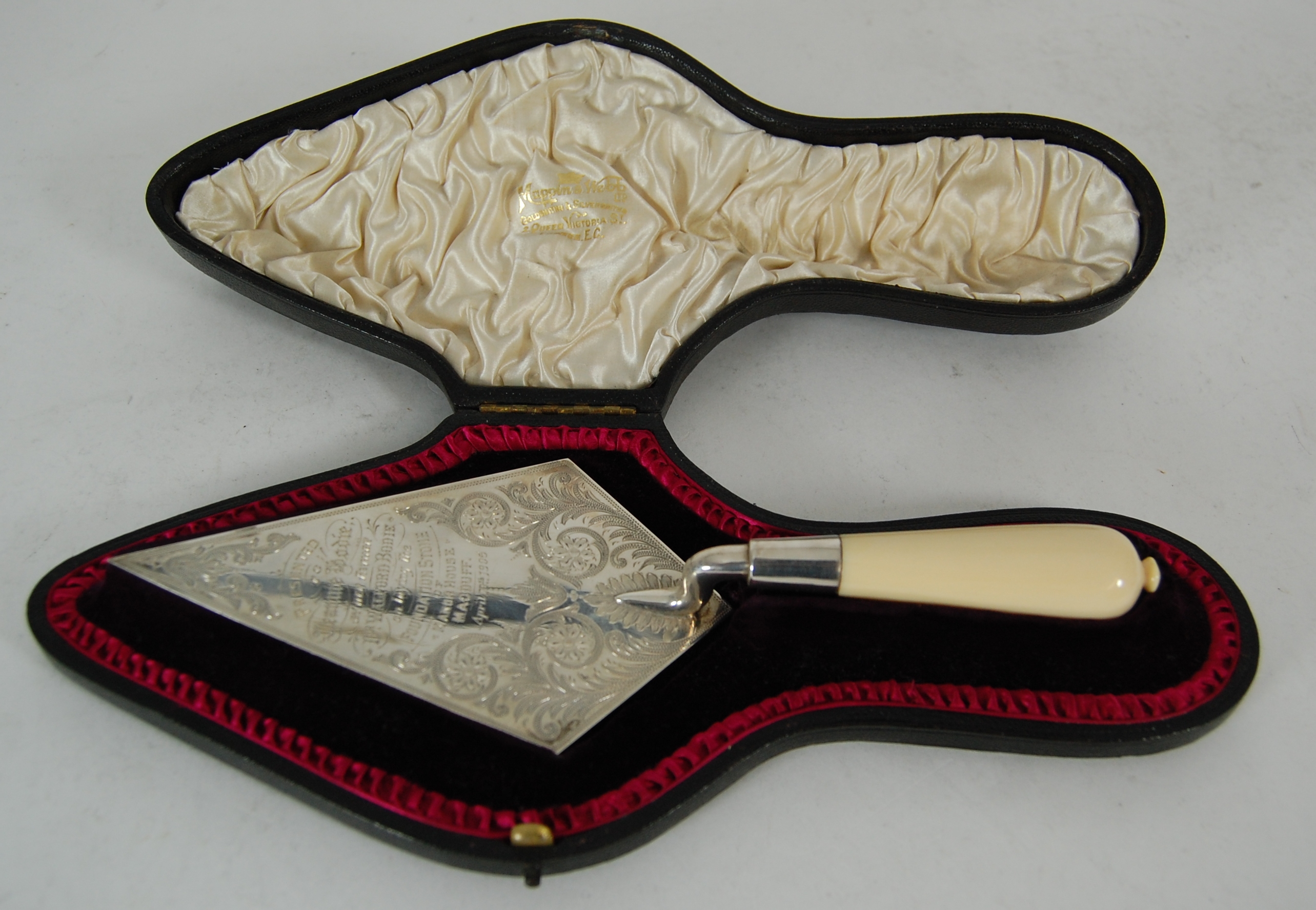 Mappin & Webb, Sheffield 1904, the triangular blade with foliate borders and presentation inscription with simple socket attachment to flared ivory handle, in original fitted case