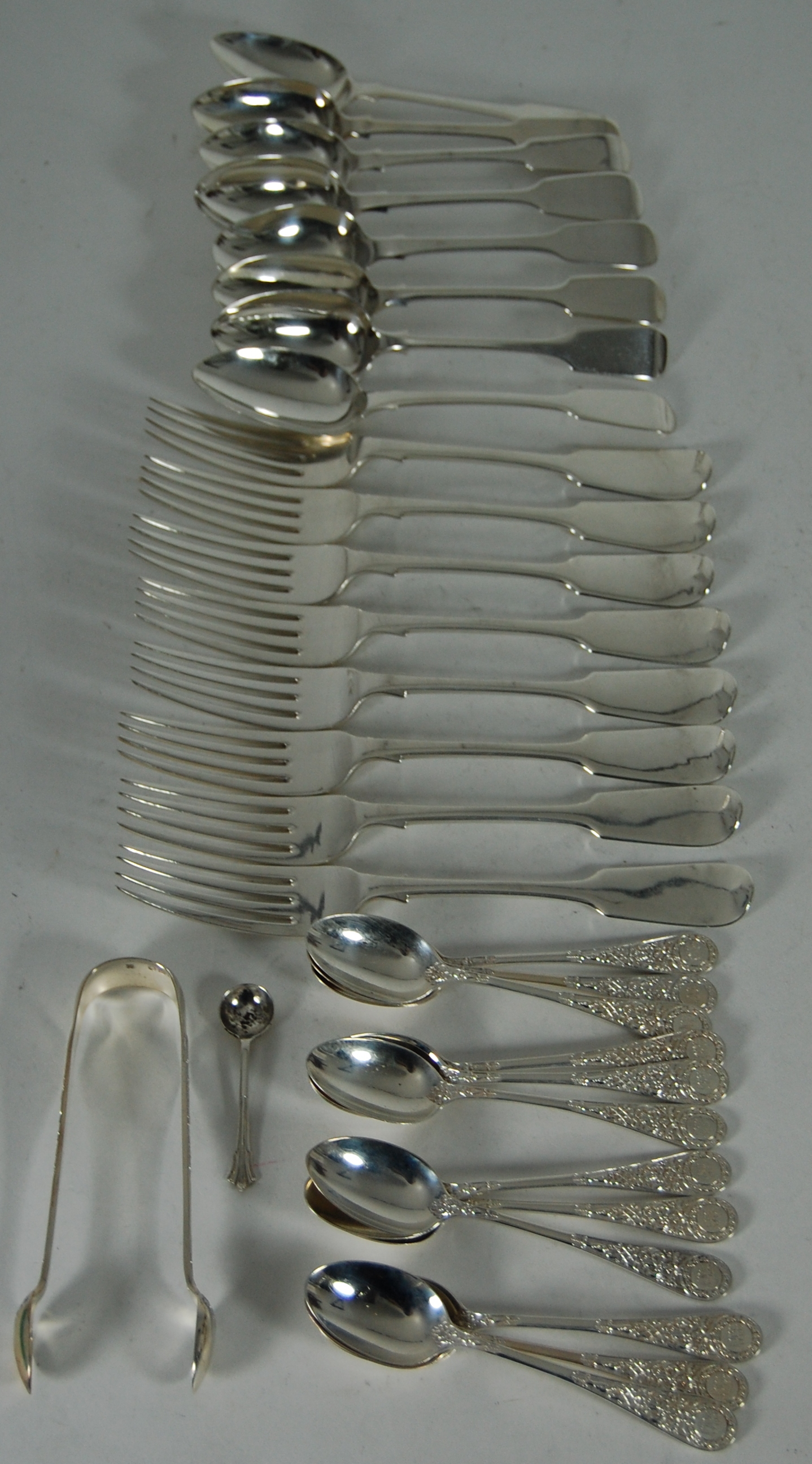 to include a set of eight Fiddle pattern tableforks, a set of double struck teaspoons and tongs etc (qty)