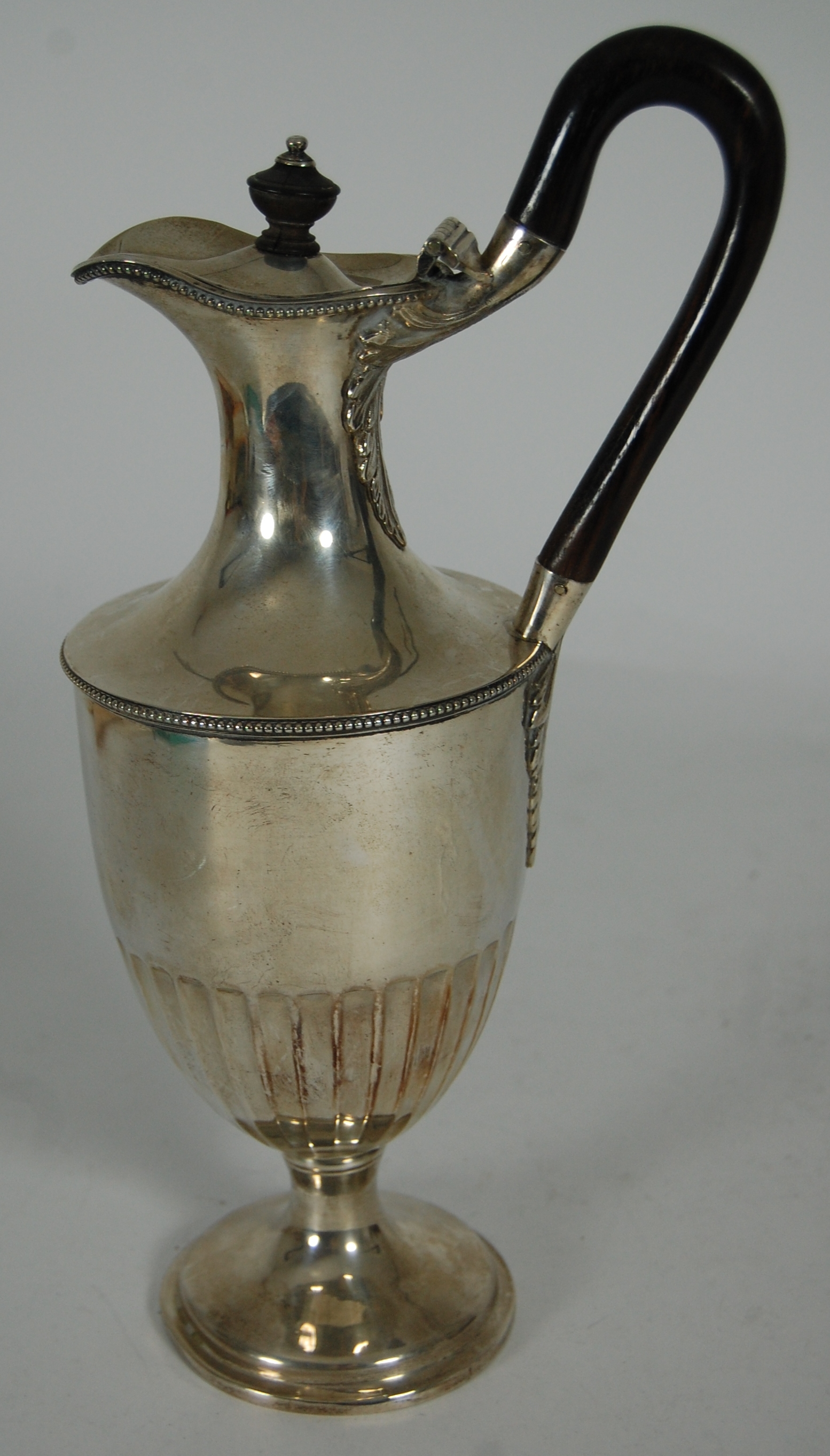London 1890, of vase form with slender neck and spout, the lower section of the body with concave fluting and with beaded rims, with simple scrolling wooden handle