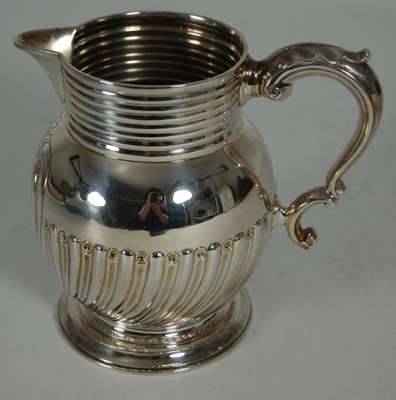 Charles S Harris, London 1884, the baluster body with semi spiralled fluted lower section with large scroll formed cartouche, the S scroll handle with acanthus thumbpiece