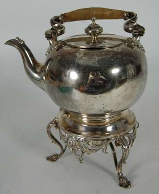 London 1874 of compressed spherical form with short curved spout and swing handle with cane work section, the circular stand with pendant swags and three S scroll acanthus supports