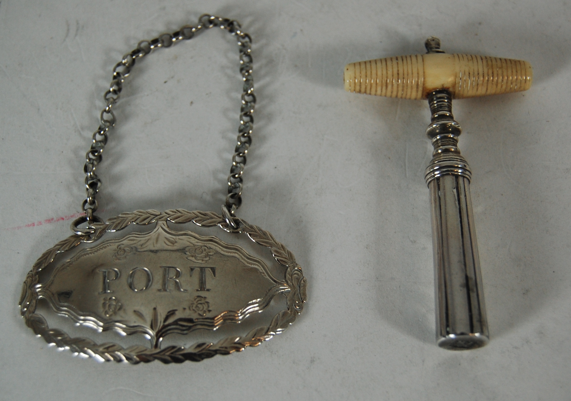 Hester Bateman, marked HB, lion passant, of pierced oval form with foliate border and engraved inner border, inscribed PORT; together with a miniature corkscrew with ivory handle, makers mark IR with crown above only (2)