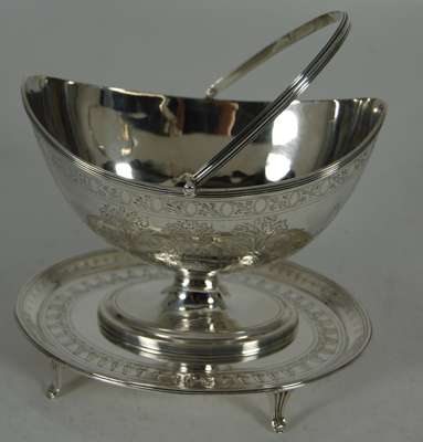 the sugar bowl by H Chawner, London 1790, of oval outline with engraved border of floral garlands and displays with reeded handle and on pedestal foot; together with a similar oval teapot stand, H Bateman (possibly) London 1789, engraved with acanthus border and central cartouche (2)