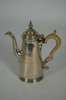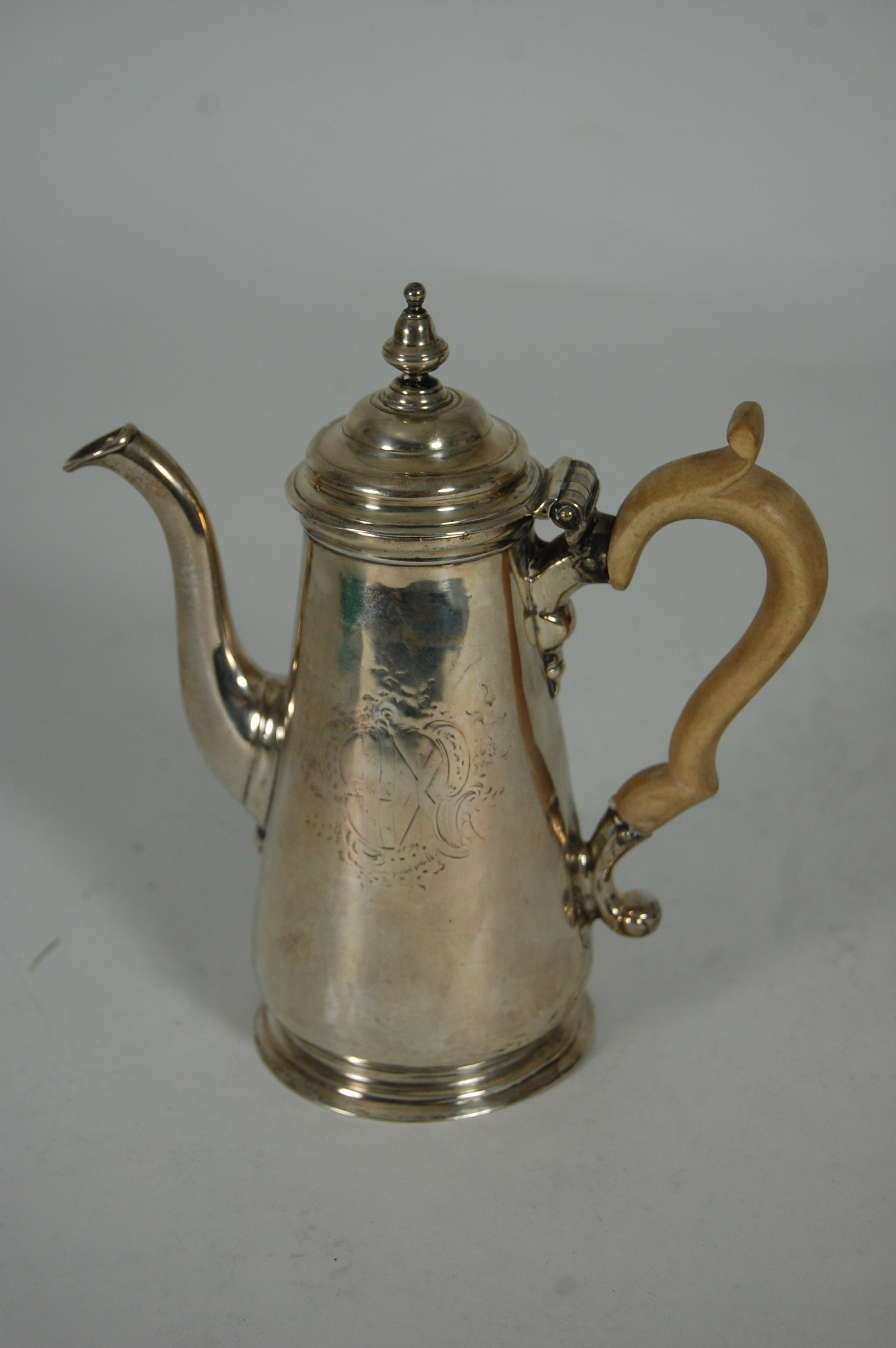 London circa 1760's, the flared cylindrical body with S scroll spout and domed hinged cover, with silver capped S scroll wooden handle