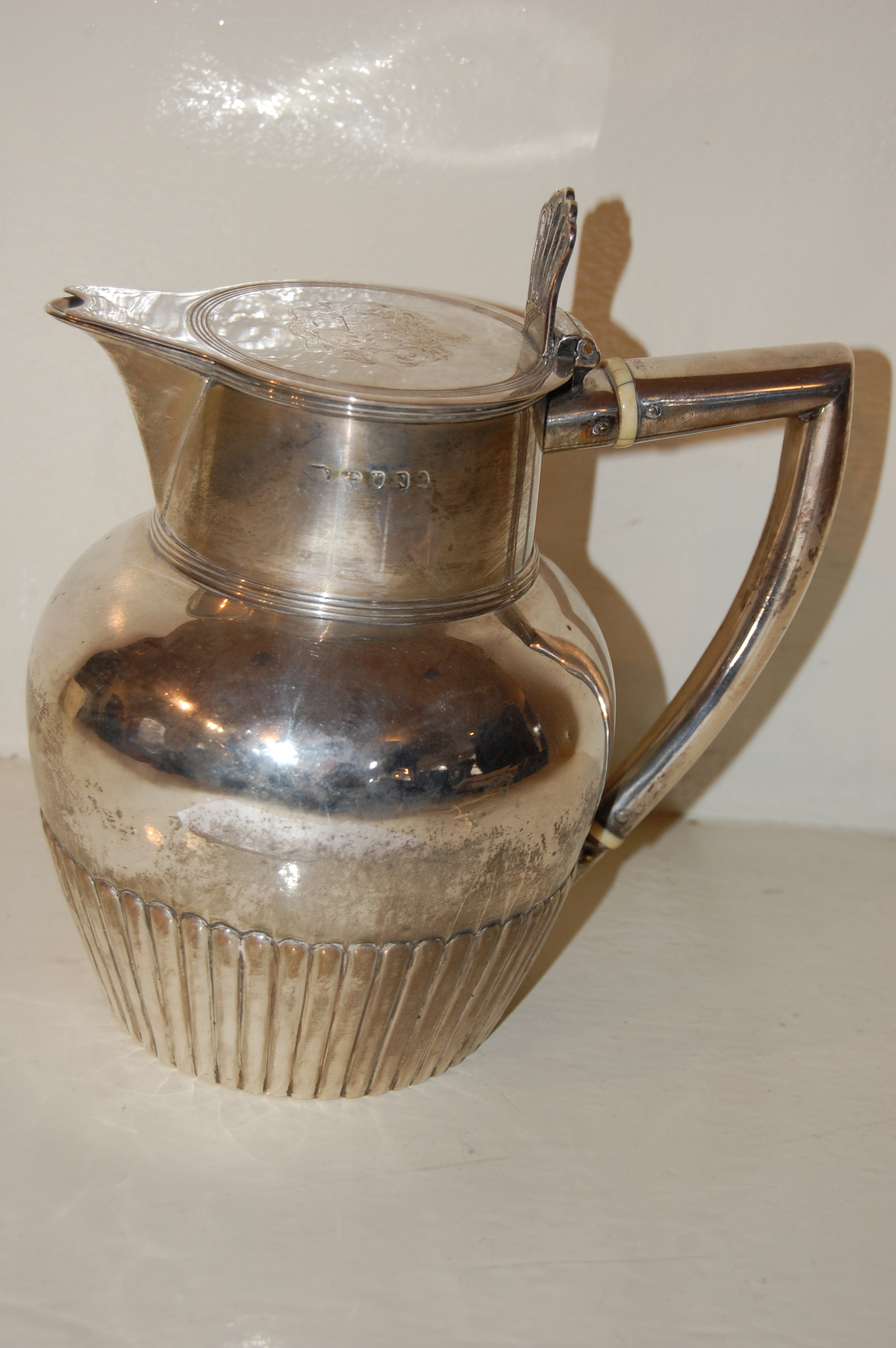 London 1808, makers mark worn, the shouldered body with gadrooned lower sections and with straight neck, with simple angular handle with ivory inserts, the flat hinged cover with open thumb piece and engraved armorial, with later hallmarks for London 1812
