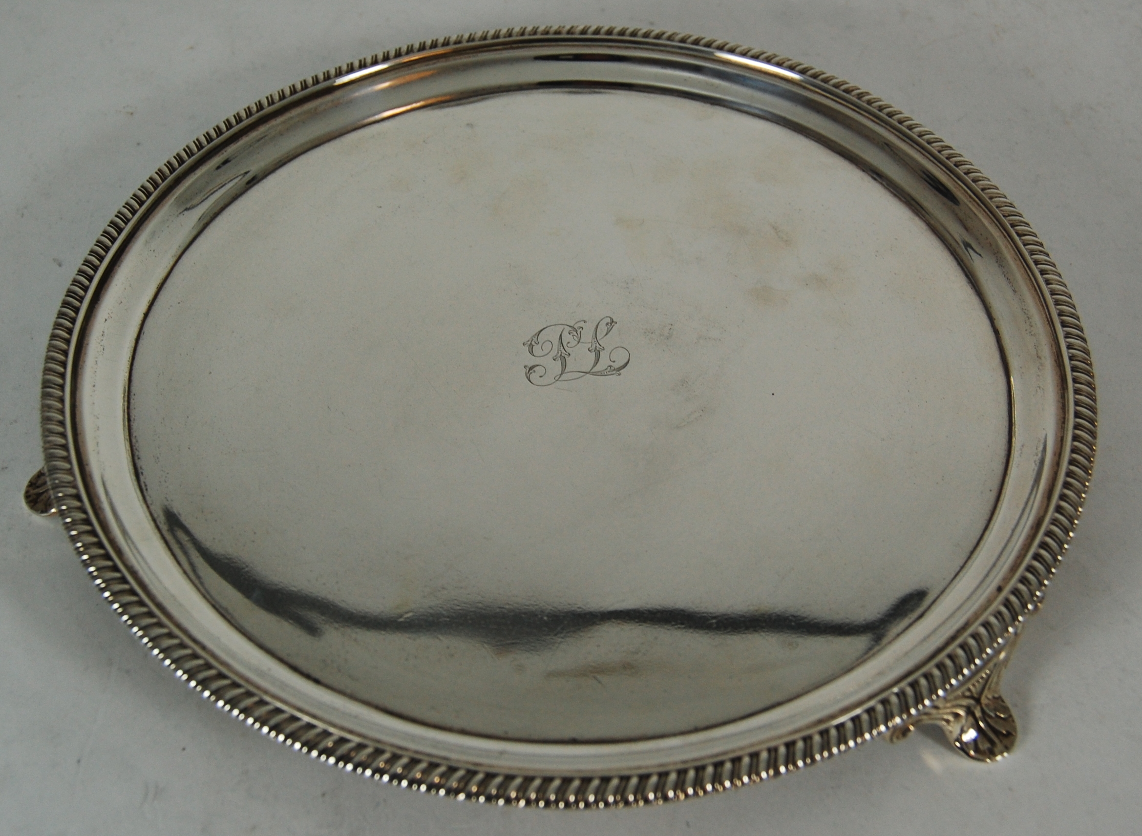 J McKay Edinburgh 1811, of circular outline with gadrooned border and foliate initials PL to centre, raised on three reeded and acanthus bracket feet