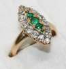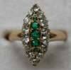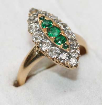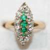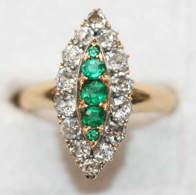 of navette shape with five graduated circular cut emeralds of good colour and clarity and a claw set diamond border, all in yellow metal