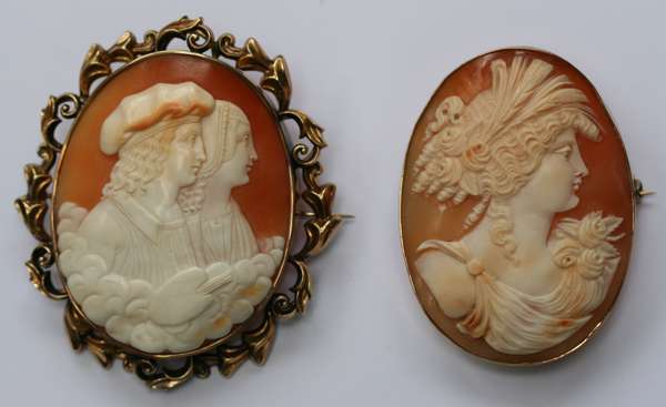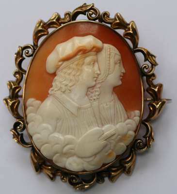 the first as a couple in profile, the man is an artist as holding a paint board and brushes, both wearing renaissance style clothing, the frame of scrolling yellow metal form, the other of a girl in profile with ornate hair style and floral clasped dress, plain gold rubover frame