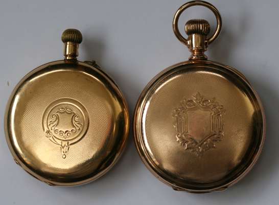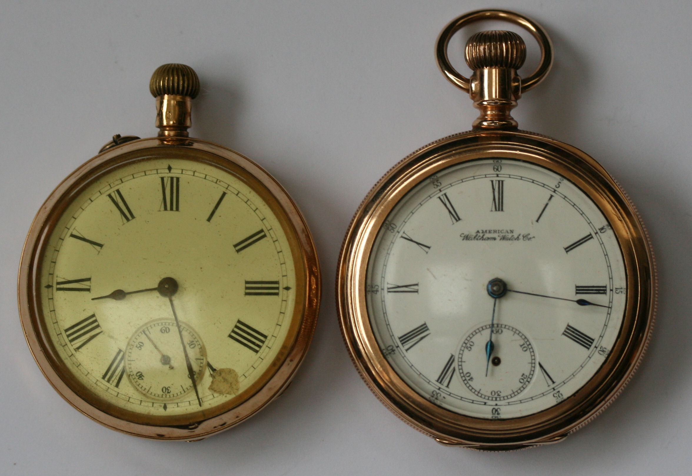 An 18K open-faced pocket watch and an AMERICAN WALTHAM CO gold plated example