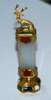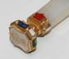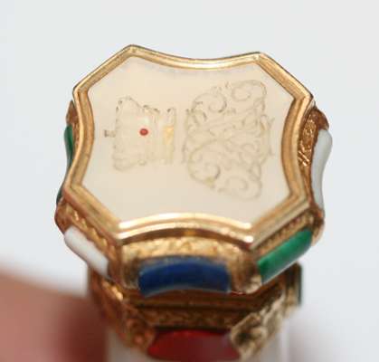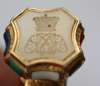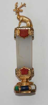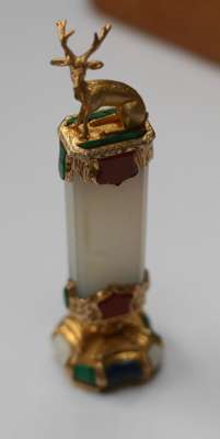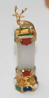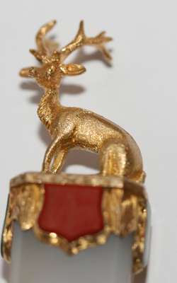 mounts unmarked, the shaped square matrix with mirrored monogram with cornet above, the mounts of chased gold set with various hardstones, with rectangular white agate handle with finely chased stag finial