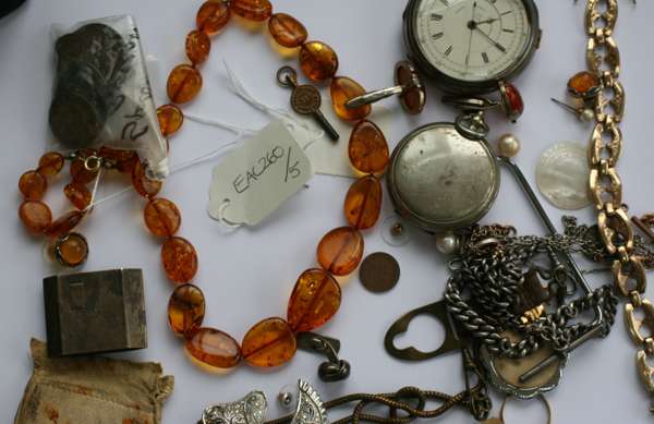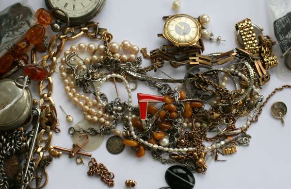 various odd coins, parts of gold and other chains, boxed Michel Herbilin wrist watch, Tissot wrist watch, two gilt metal flexible bracelets, (unmarked) silver albert, silver brooch, faux pearl necklaces, silver cased pocket watch, pocket Army Issue compass, amber necklace, ring, turquoise set tie pin, small circular diamond set pendant and miscellaneous jewellery