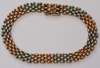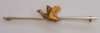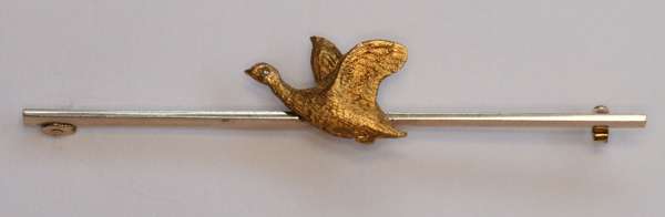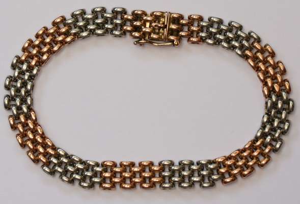 with a hardstone oval panel, with onset carved hardstone small flower, all within a scrolling pinchbeck border; an Edwardian 15ct two colour gold bracelet, composed of alternating white and red gold panels of linked curb links, plain clasp with safety clip, 19cm long; a pearl and diamond set brooch, Belle Époque period, of offset square shape, with diamond set leaves, pearl set points, all in white gold, 30mm square; a silver brooch, of petal form with an applied natural gem stone crystal, textured finish to the leaves, (unmarked) 37mm wide; a mid 20th century gold bar brooch, the white gold face bar with onset chased flying goose, 65mm wide; an early 19th century pearl set brooch, of very slight rounded rectangular form, set half seed pearls, plain gold mount (Qty)