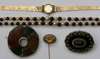 a pearl and garnet bead long double graduated necklace; a circular Scottish hardstone brooch of circular form; a Victorian oval momento mori brooch; an Omega 9ct gold lady's wrist watch and flexible bracelet; a fob; citrine and pearl brooch; various gem set gold rings and wedding bands; and a bracelet (qty)