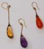 two pairs of pendant ear drops, the first with simple wire loop, chain suspension and plain jade bi-discs; the second pair with simple wire loops, chain link suspension, pierced oval suspension with shaped wire clasping the circular flat lapis discs; Jade 36mm, Lapis 50mm; three pairs, each with simple wire loops, simple chain link suspension with pendants of briolette cut amethyst, pear shaped citrine and a cornelian