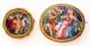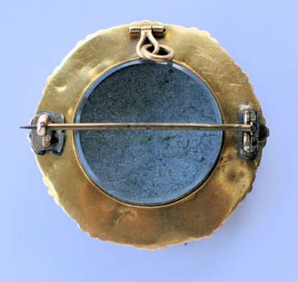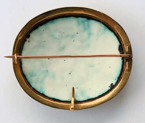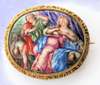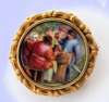 mounted in chased gold brooch, the plaque depicting a couple in an interior, another circular brooch with a scene of a tavern and drinkers, also in gold mount (2)
