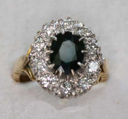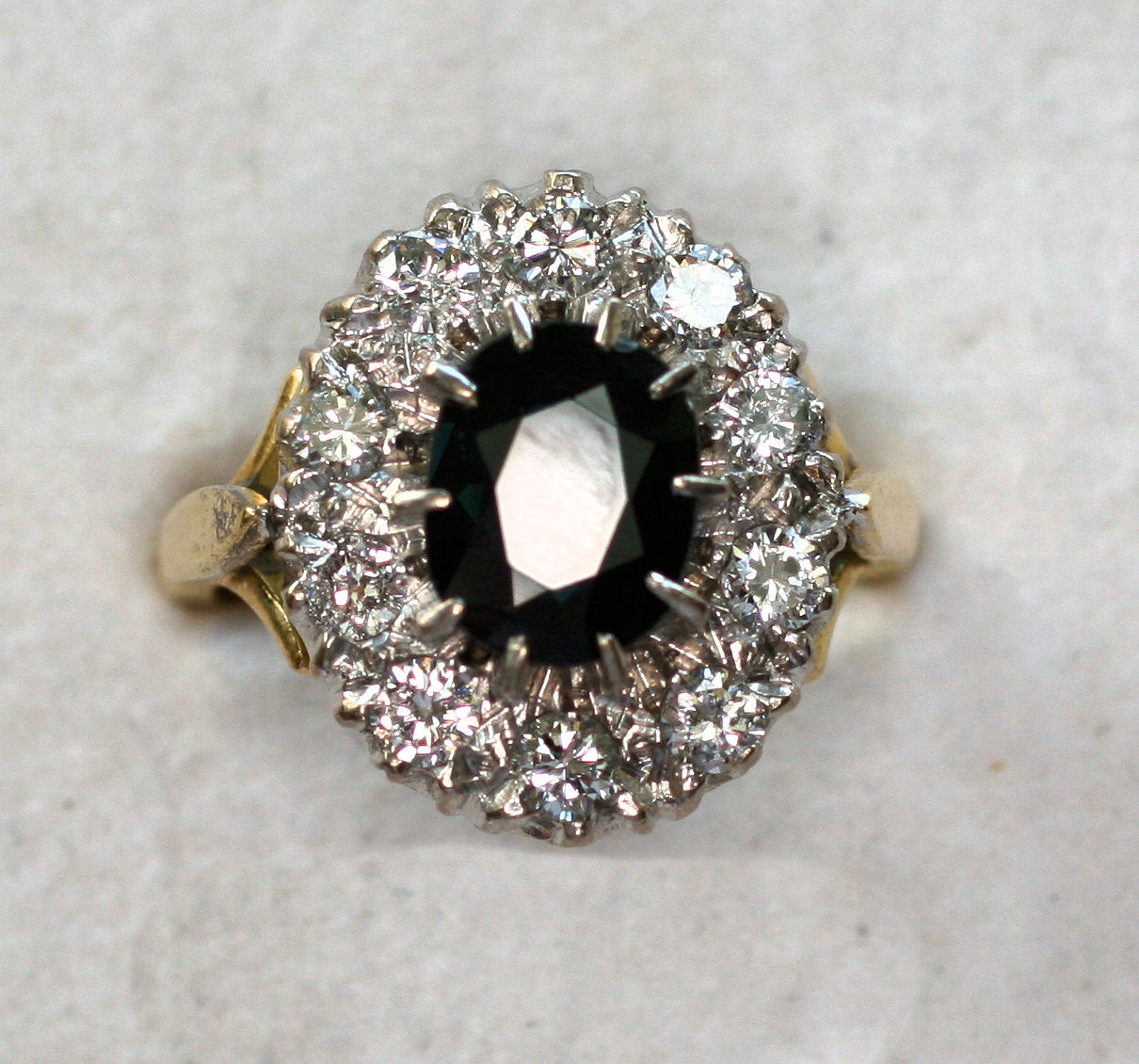 the central oval sapphire with a border of ten circular brilliant cut diamonds all in white gold, 18ct gold shank