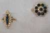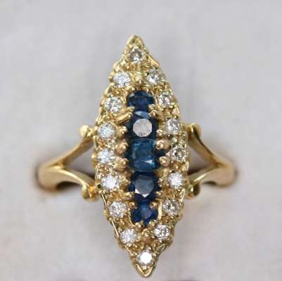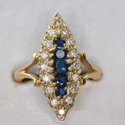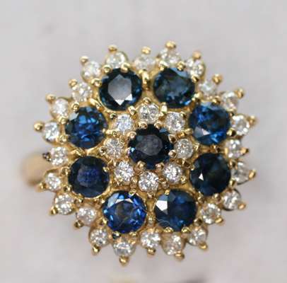 the larger ring with a central circular cut sapphire, border of eight circular cut diamonds, eight further circular cut sapphires and an outer border of twenty four further diamonds, all set in 18ct yellow gold, the other ring of navette shape with central graduated row of five sapphires and conforming border of diamonds, also set in 18ct yellow gold (2)