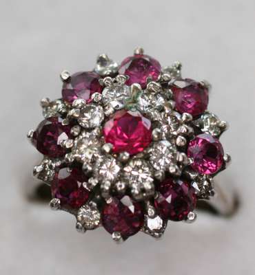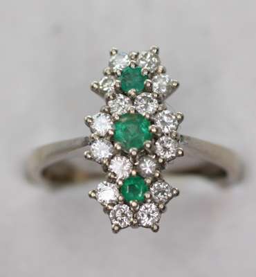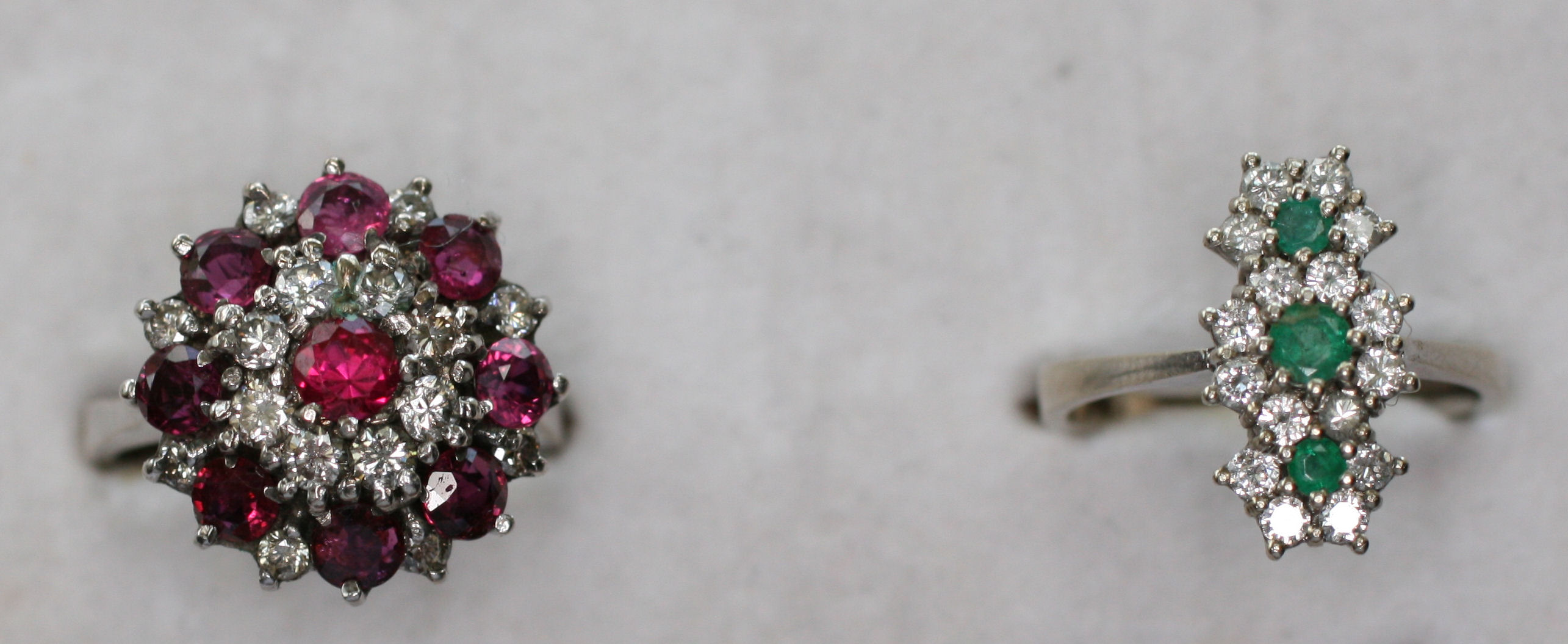 of circular form, stepped rows of rubies and diamonds, cage setting, together with a diamond and emerald triple floral cluster ring, all set in 18ct white gold (2)