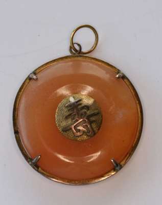 the bi-disc of pale orange colour, simple gilt metal frame, with a central disc with chased Chines symbols, plain loop bale