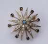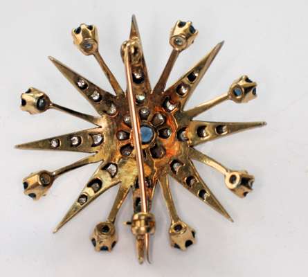 as a star, with central sapphire, diamond set border and radiating arms, sapphire terminals