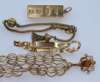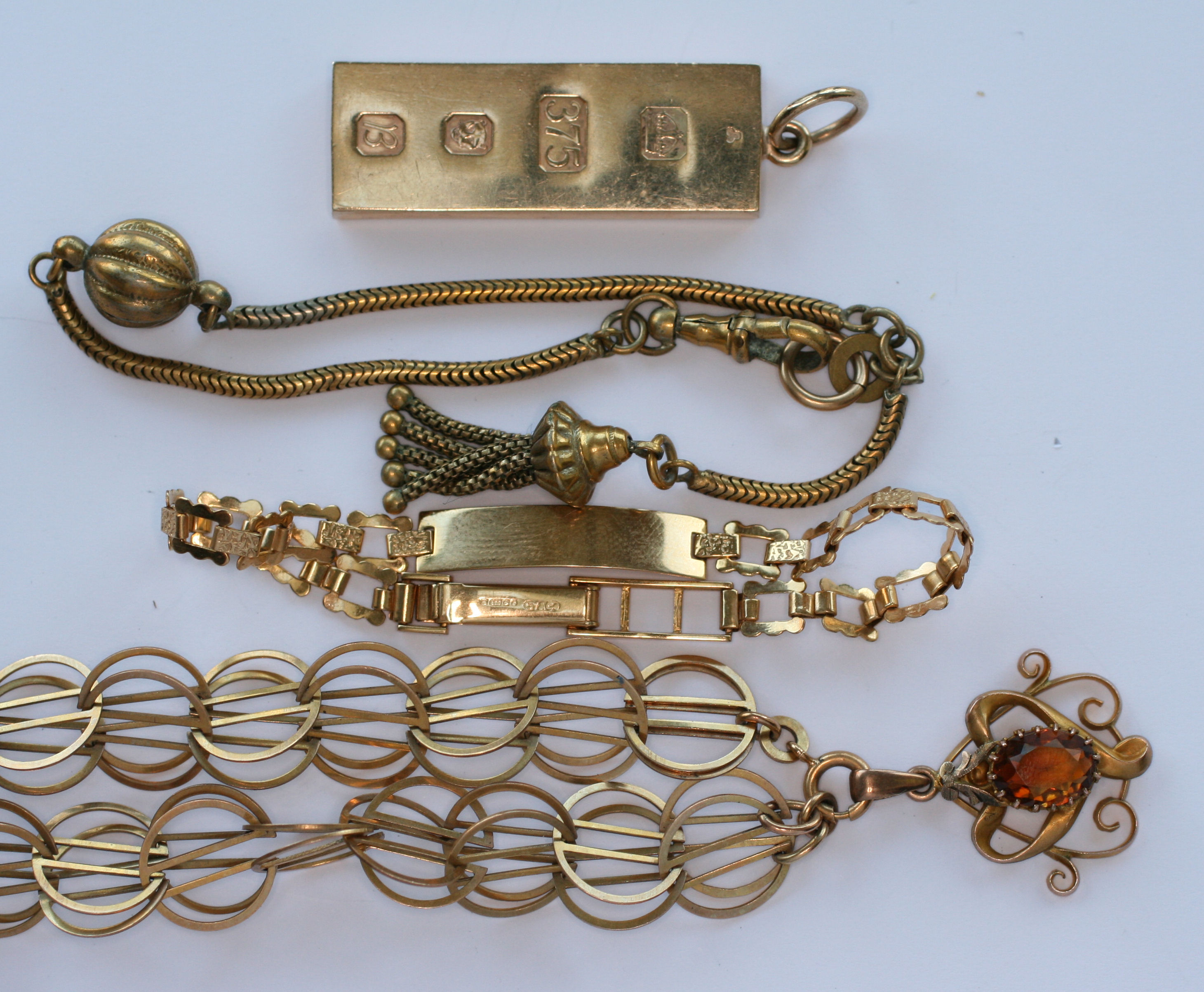 a 9ct gold ingot pendant; a yellow metal albert; a 9ct gold neck chain of large open circular links and a citrine art nouveau pendant; a 9ct gold ID bracelet (4)