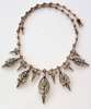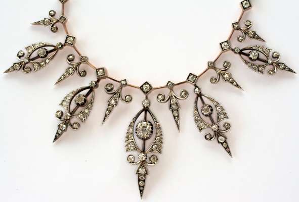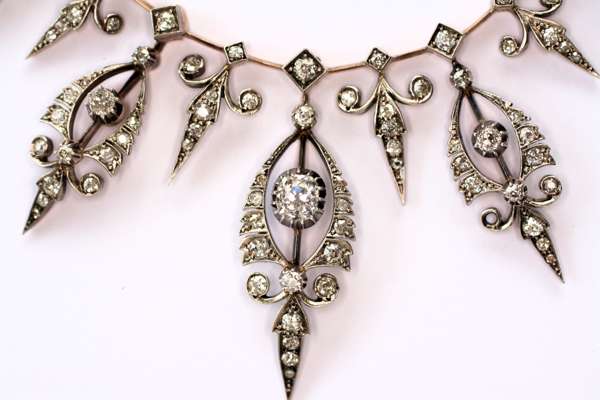 all set in gold with silver facings, the neck chain with box set diamond bar links, the fringe of graduated form, diamond box set terminals with alternating diamond set drops of leaf form and palmette motifs with claw set old cut diamond to the centre