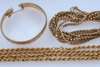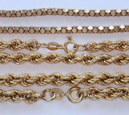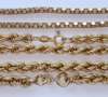bright cut decoration; two 9ct gold rope twist neck chains and a 9ct gold long guard chain of facetted links (4)