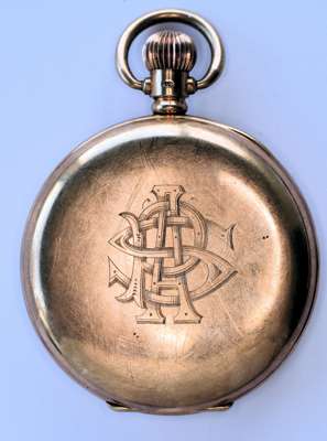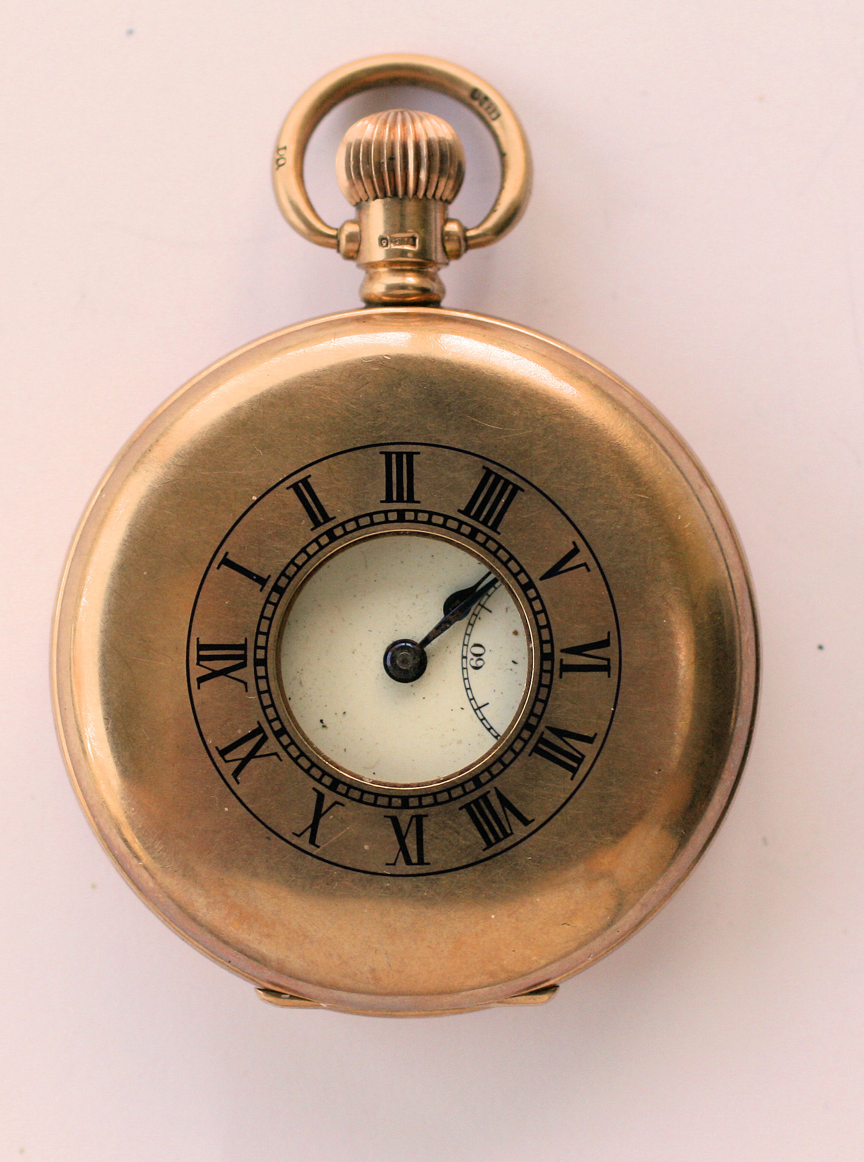 in a demi-hunter case, keyless wind action, enamel outer Roman numerals, lever movement