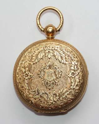 engraved open faced, key wind lever movement, plain enamel dial, subsidiary seconds dial, chased floral case