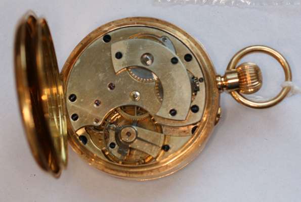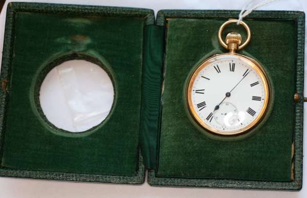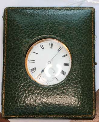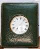 open faced, white enamel dial, lever movement, the hinged cover engraved with a monogram, 755 control marks, contained in a leather covered travel case