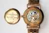 the inscribed champagne dial with baton numerals, subsidiary second's hand, engraved inscription to the rear, bark effect gold strap
