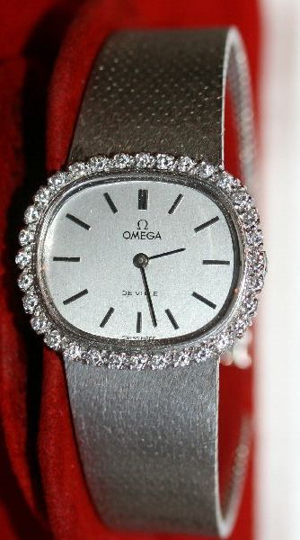 set in 18ct white gold, textured flexible bracelet, rounded rectangular silvered dial, baton numerals, diamond set bezel, all in fitted cases